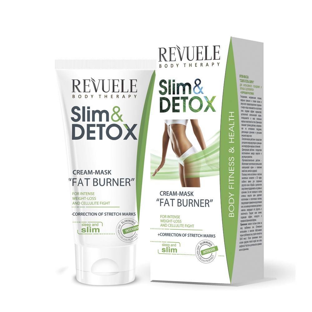 Revuele Slim and Detox Fat Burner Green vermindert straie en helpt tegen cellulitis. Dit creme masker heeft een triple effect, het help bij afvallen, detoxen en het verbeterd je huid structuur. De formule zorgt ervoor dat je doorbloeding verbeterd, vetcellen worden afgebroken en afgevoerd en cellulitis wordt verminderd.